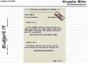 CryptoBit No. II is the ACA 80th anniversary cryptogram. It contains of three ciphers, where the second and third cipher can only be solved using the solution of the prior cipher. It is in english language.