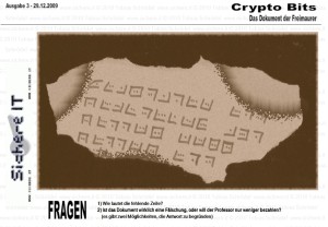 In KryptoBit Nr. III geht es um ein uraltes Foto, welches ein noch älteres und unbekanntes Dokument der Freimaurer zeigt. Es enthält die Geheimschrift der Freimaurer und wäre damit eine Sensation. Ein Professor behauptet aber, dass das Foto und das darauf abgebildete Dokument eine Fälschung seien. Beides sei nichts wert, sagt er ...